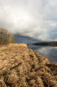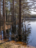 Wiosna woda wysoki w lesie nad jeziorem. Krajobraz