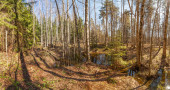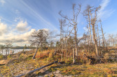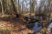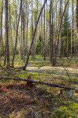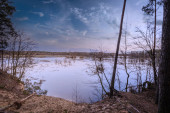 Wiosna woda wysoki w lesie nad jeziorem. Krajobraz