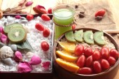 Owoców melon kantalupa pomarańczowy soczysty na tle drewna.