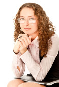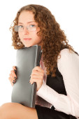 piękna młoda kobieta w czarne spodnie i Kurtka na białym tle