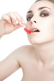 Kobieta z ring różowy patrząc do aparatu (punkt skupienia na klejnot)