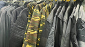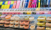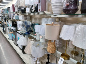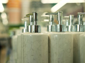 Wyświetlanie dozowników mydła w sklepach z artykułami gospodarstwa domowego akcesoria o plamistym, beżowym wzorze i czarne lub srebrne szczyty pomp, ułożone w koszyku z drutu.