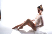 atrakcyjna młoda kobieta, owinięte w tkaniny, siedząc na podłodze