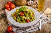 Tagliatelle w języku włoskim kolory, pieczone pomidory, bazylia Tagliatelle