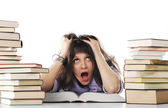 zmęczony badań, młoda kobieta siedzi na jej biurku z książki