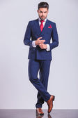 Zamyślony młody biznes człowiek siedzi razem z jego rąk