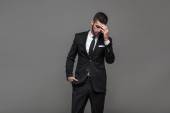 Przemyślany biznes młody człowiek siedzi na drewniane pudełko