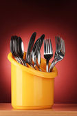 sztućce kuchenne, noże, widelce, łyżki w żółty stoją na białym tle