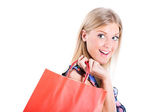 piękna kobieta w kolorze złota z zakupami na białym tle.
