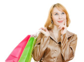 piękna kobieta w kolorze złota z zakupy wskazuje palcem na białym