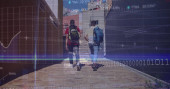 Zamaskowani przyjaciele studiujący nakładki na dane smartfona w dzielnicy miejskiej, z wykresami, kodem i plecakami. Urbanistyka, technologia, współpraca, nowoczesny, profesjonalny, innowacje, tworzenie sieci kontaktów