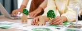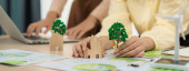 Obraz ten odzwierciedla wspólną sesję projektową, podczas której zespół skupia się na zrównoważonej architekturze, modelach prezentacji, szkicach i ekologicznych koncepcjach na stole. SACTR