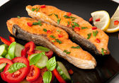 Pieczony łosoś z serem i migdałów skorupą i przyozdobionym z puree z ziemniaków i zielonego groszku