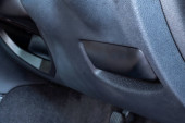 Widok z bliska na podłokietnik samochodowy z teksturowaną czarną tkaniną i widocznymi detalami szwów pokazującymi nowoczesny design samochodowy i funkcje komfortu.