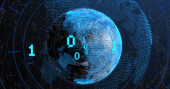 Glowing dotted Earth globe hovering in virtual digital space, with grid plane floating code streams. Futuristic, cyberspace, technology, data, digital, network, virtual