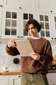 Zdjęcie "Młody człowiek studiuje online, uśmiecha się i pracuje na laptopie w nowoczesnym mieszkaniu." może być wykorzystywane do celów osobistych i komercyjnych zgodnie z warunkami zakupionej licencji Royalty-free. Obraz jest dostępny do pobrania w jakości wysokiej rozdzielczości do 5760x3840.