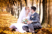 ślub para siedzi przy żółty liście jesienią parku tło
