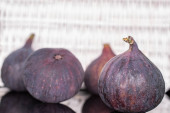 Świeże fioletowe figi z miską dojrzałych fig na białym tle. Zdrowe owoce sezonowe bogate w witaminy i składniki odżywcze, idealne do książek kucharskich, blogów i zdrowego stylu życia treści.