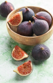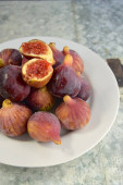 Świeże figi w białej misce i pokrojona figa na tkaninie. Idealny obraz do książek kucharskich, blogów kulinarnych, zdrowych przepisów kulinarnych, diety śródziemnomorskiej i koncepcji naturalnego, pożywnego jedzenia