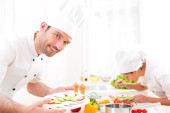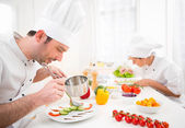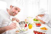 Młody atrakcyjny profesjonalnym kucharzem degustacji sosem