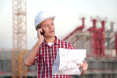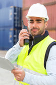 Młody atrakcyjny Doker przy użyciu telefonu komórkowego w pracy