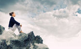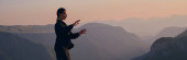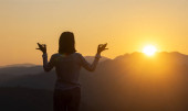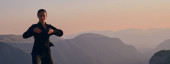 Kobieta praktykująca Tai Chi w tradycyjnym czarnym stroju na górze o wschodzie słońca, jej ramiona wyciągnięte w pozycji do medytacji, skupia się na równowadze, energii i uważności w przyrodzie.