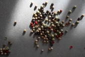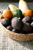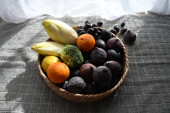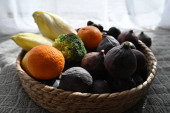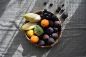 Zbliżenie do białej miski wypełnionej jasnopomarańczowymi jagodami rokitnika i liściem bazylii, symbolizującym ciepło, zdrowie i naturalne witaminy.