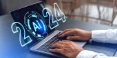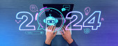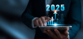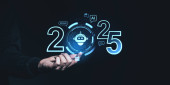 Hands typing on laptop with glowing 2026 text and business charts overlay, futuristic interface on dark blur background, concept of future technology