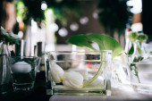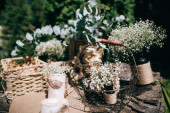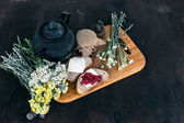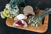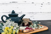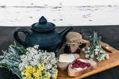 Dżem malinowy i chleb z masłem w słoiku i gorąca herbata ziołowa na drewnianym stole śniadanie obiad