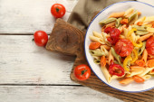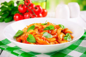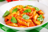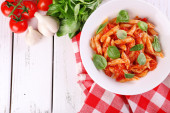 Makaron z sosem pomidorowym i bazylią na stole z bliska
