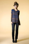Młoda piękna blondynka w dżinsy i buty na białe tło
