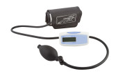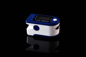Pulsoksymetr jest medycznym przyrządem diagnostycznym do pomiaru poziomu nasycenia tlenem we krwi kapilarnej (dotlenienie) izolowanym na białym tle, makro.