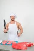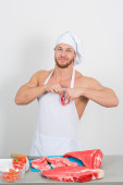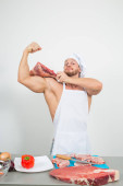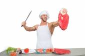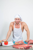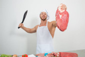 kulturysta szef kuchni przygotowuje się duże kawałki surowego mięsa.