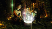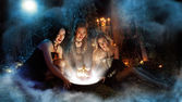 Sześć pięknych czarownice są patrząc na kamery. Ciemny Las na