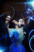 Zdjęcie "Sześć pięknych czarownice są patrząc na kamery. Ciemny Las na" może być wykorzystywane do celów osobistych i komercyjnych zgodnie z warunkami zakupionej licencji Royalty-free. Obraz jest dostępny do pobrania w jakości wysokiej rozdzielczości do 5760x3840.