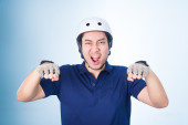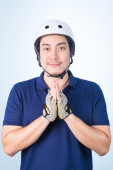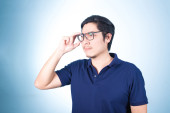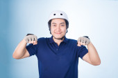 Azjatycki przystojny mężczyzna z kluczami jego nowy samochód, na niebieski backgro