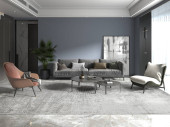 Elegancki nowoczesny pokój dzienny z szarą sofą, rumieniec i krzesła z kości słoniowej salon, ściana marmurowe oświadczenie i abstrakcyjne dzieła sztuki, okrągłe stoły do kawy, dywan, palma doniczkowa, miękkie światło dzienne, renderowanie 3D.