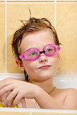ładny chłopak bawić się w łazience. chłopiec w pianki kąpieli i pływania iść