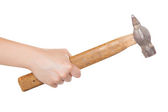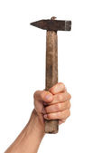 ręka trzymać stary młotek. na białym tle na czarnym tle