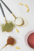 Zdjęcie "Pionowe ujęcie kobiecej ręki złotą łyżeczką, pijącej napój sojowy z nasionami szałwii w przezroczystej szklance obok owoców i granoli na ciemnym stole i beżowym tle. Odbiór. Pojęcie zdrowej żywności i powolnego życia" może być wykorzystywane do celów osobistych i komercyjnych zgodnie z warunkami zakupionej licencji Royalty-free. Obraz jest dostępny do pobrania w jakości wysokiej rozdzielczości do 5760x3840.