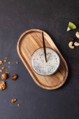 Pionowe ujęcie kobiecej ręki złotą łyżeczką, pijącej napój sojowy z nasionami szałwii w przezroczystej szklance obok owoców i granoli na ciemnym stole i beżowym tle. Odbiór. Pojęcie zdrowej żywności i powolnego życia