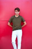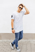 Facet w czarną koszulę stojąc na ulicy na tle ściany z czerwonej cegły z graffiti