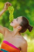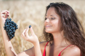 Idealna kobieta jedzenie winogron w polu pszenicy. piknik.