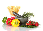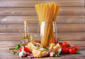 spaghetti, makaron w misce, słoik oleju i warzywa na drewnianym stole isola