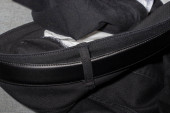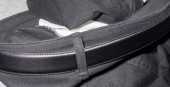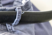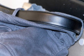 Close-up widok czarny skórzany pasek na miękkim tle tkaniny przedstawiający szczegóły szycia i tekstury idealny do projektów mody i akcesoriów.