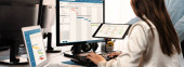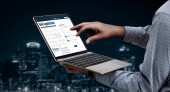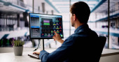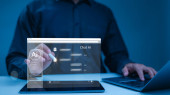 Profesjonalista korzystający z laptopa z zaawansowaną technologią AI i analityką danych do zarządzania projektami. Wizualizacje postępów i pomoc w planowaniu strategicznym w pobudzaniu wzrostu przedsiębiorstw i rozwoju technologii cyfrowych