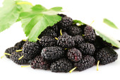 Kupie dojrzałe morwy z zielonych liści na stole z bliska