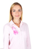 Kobieta przy użyciu Różowej Wstążki na jej piersi na białym tle