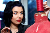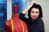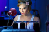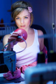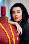 kobieta krawcowa pozowanie w pobliżu maszyna do szycia