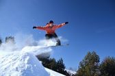 Snowboardzista podczas skoku w wysokie góry w słoneczny dzień.